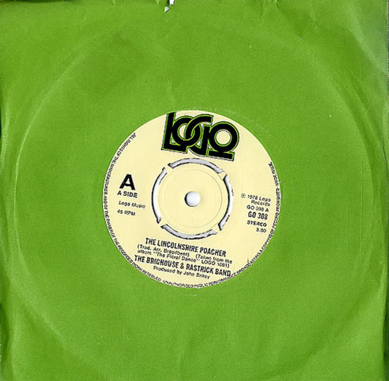 BRIGHOUSE & RASTRICK BRASS BAND The Lincolnshire Poacher (1978 UK Logo 7" vinyl single with intact four-prong centre, also including Tijuana Tuba, green company die-cut paper sleeve GO308)