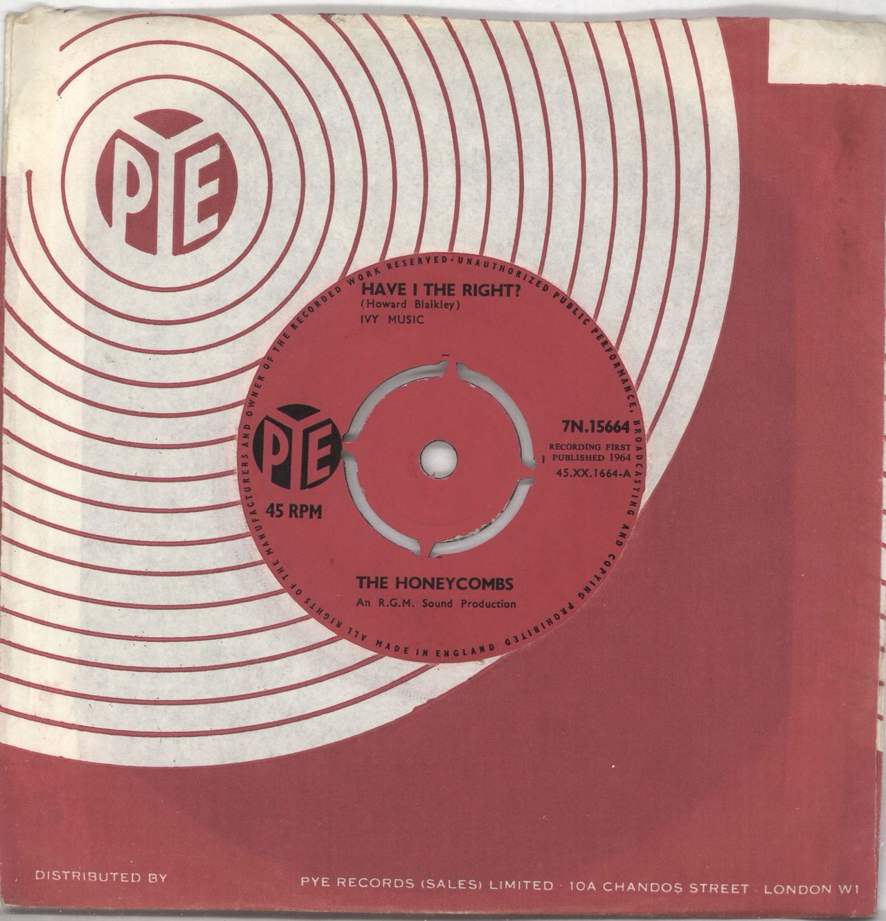 THE HONEYCOMBS Have I The Right? (1964 UK 7" vinyl single with an intact four prong centre, also including Please Don't Pretend Again,repro Pye company die cut paper sleeve. The vinyl grades EX/EX- with a few light paper scuffs not affecting play 7N.15664)