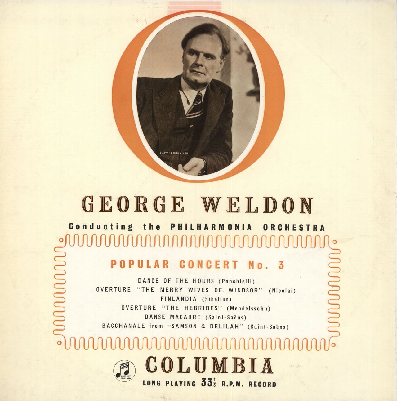 THE PHILHARMONIA ORCHESTRA conducted by GEORGE WELDON Popular Concert No. 3 (Early 60s UK issue of the 1956 6-track Mono LP on the green & gold columbia label, fully laminated flipback picture sleeve. The flimsy sleeve shows just a little light wear with a bit of discolouration at the opening and the vinyl remains in excellent condition with few signs of play 33SX1054)