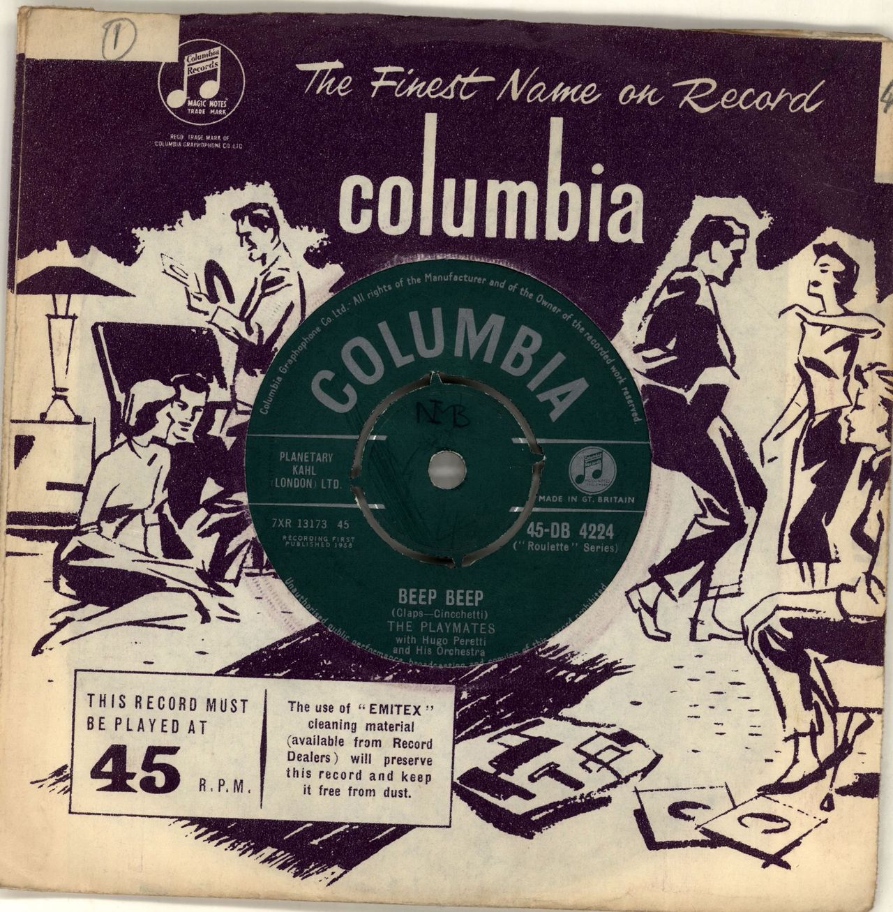 THE PLAYMATES Beep Beep (1958 UK 7" vinyl single with intact four prong centre, also including Your Love, Columbia company die cut paper sleeve 45-DB4224)