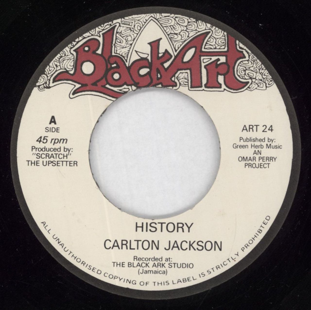 CARLTON JACKSON & THE UPSETTERS History (UK issue of the 70's split 7" vinyl single with wide-centre and printed text, Old Dub on the B-side. Housed in a plain die-cut sleeve. The vinyl remains in Excellent condition)