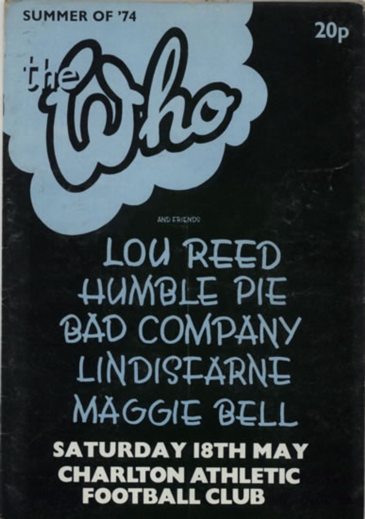 THE WHO Summer of '74 (Rare 1974 UK 16-page programme from their gig at The Valley, Charlton Athletic Football Club on Saturday 18 May 1974. The programme features a double page feature on the Who with great 'live' photograph, plus informationand pictures of the support bands who were Lou Reed, Humble Pie, Bad Company, Lindisfarne & Maggie Bell.