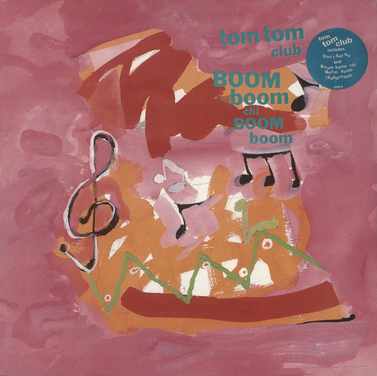 TOM TOM CLUB Boom Boom Chi Boom Boom (1988 UK 10-track vinyl LP by the American new wave trio started by husband and wife team Tina Weymouth and Chris Frantz as a Talking Heads side-project. Includes versions of Bob Dylan's She Belongs to Me and Lou Reed's Femme Fatale, hype-stickered matt finish outer picture sleeve with glossy thick card picture inner. The sleeve shows light wear, whlist the vinyl has just a couple oflight hairlines with little or no impact on play SFLP8)