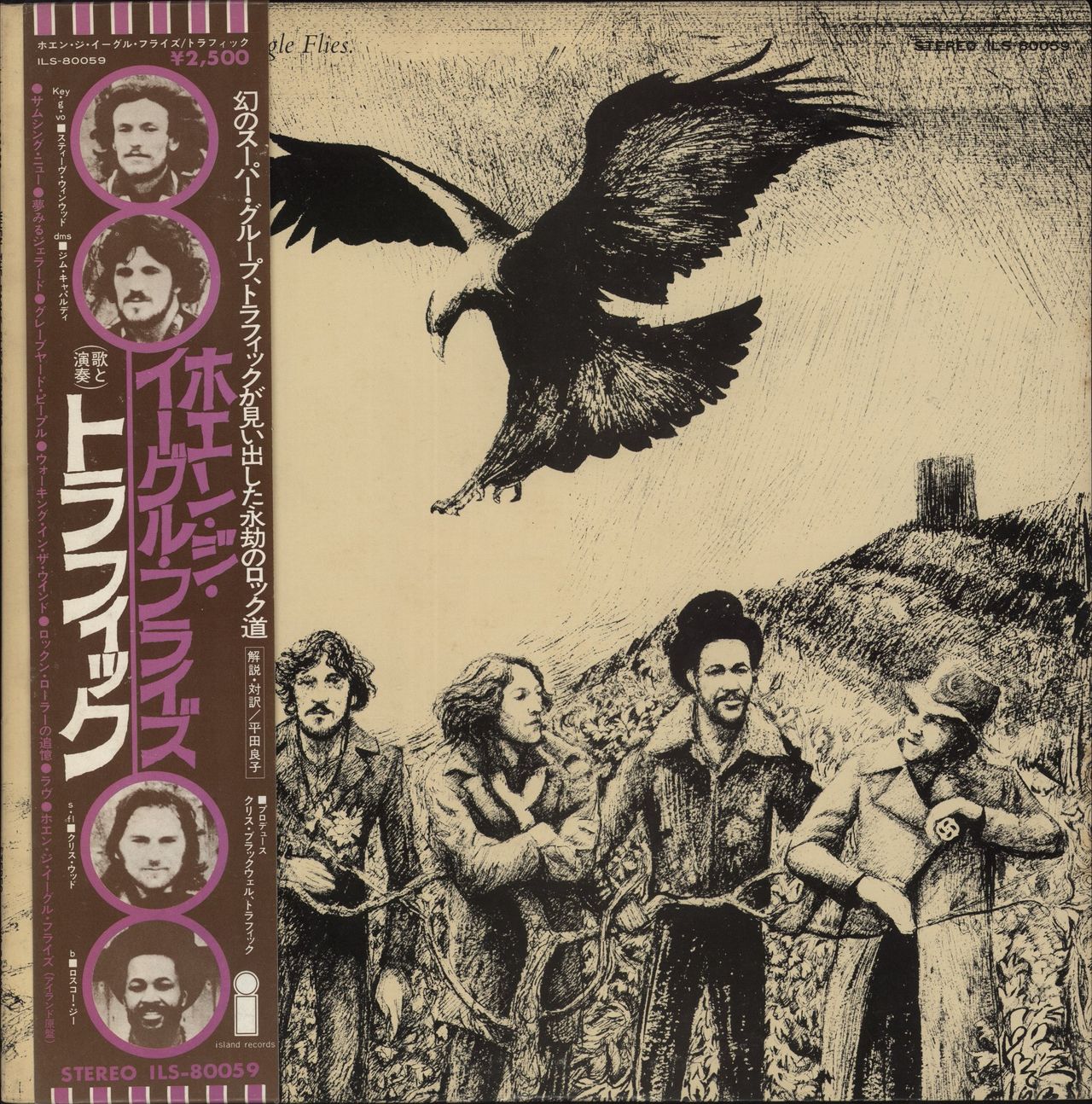 TRAFFIC When The Eagle Flies (Original 1974 Japanese Island label 7-track promo sample vinyl LP with the Japanese characters for promotional on the labels, featuring a collaboration with the Bonzo Dog Band's Vivian Stanshall on 'Dream Gerrard', housed in a colour pasted picture sleeve complete with 4-page biography/lyric insert, lyric inner and picture obi-strip. The sleeve shows minimal wear and the vinyl is Near Mint ILS-80059)
