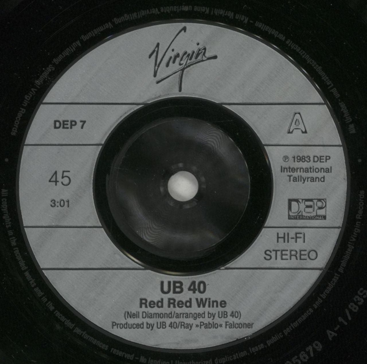 UB40 Red Red Wine (Classic 1983 UK injection centre 7" vinyl single, also including Sufferin', housed in a plain die-cut paper sleeve DEP7)