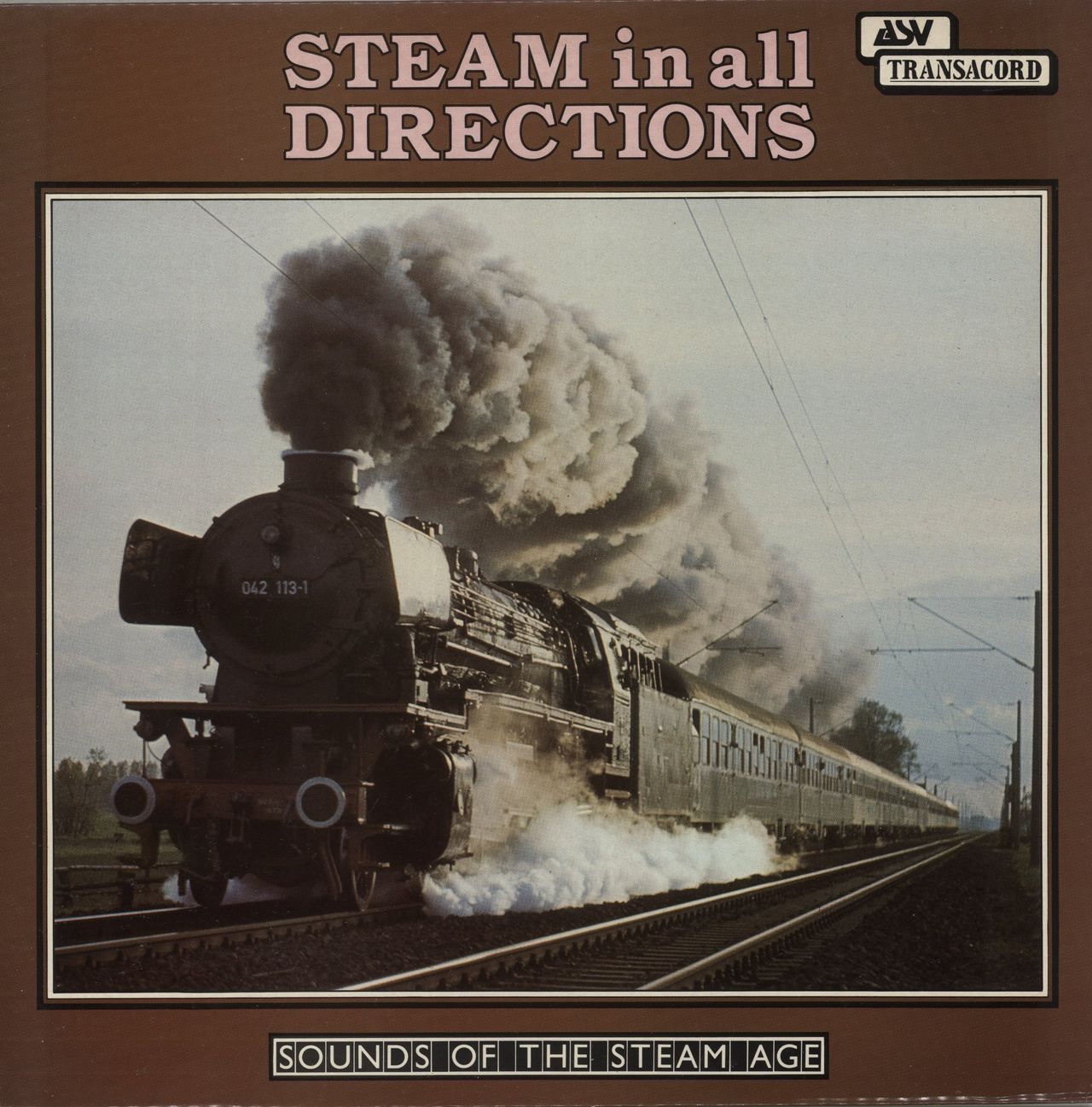 VARIOUS-TRAINS Steam In All Directions (1981 UK 7-track vinyl LP, steam locomotives at work in England, Scotland, Wales, Germany, Italy, Romania and Yugoslavia, picture sleeve. Both the sleeve & vinyl are Near Mint ATR7012)